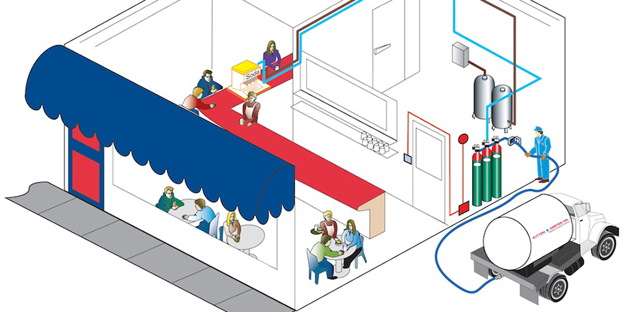 Sutton-Garten will correctly size and provide a 300lb, 550lb or 750lb bulk CO2 storage tank at your site where liquid CO2 is securely transferred through the outside wall of your store. Bulk Tanks can also be placed outside if needed.